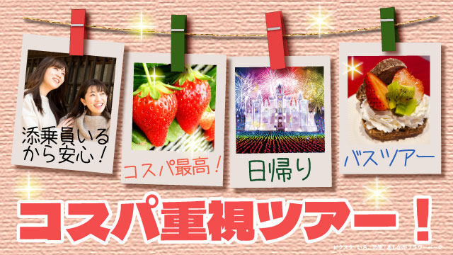 コスパ・タイパ抜群のバスツアー!ご家族・お仲間・女子旅や卒旅にぴったり。映えスポットや推しグルメなどもお楽しみです。