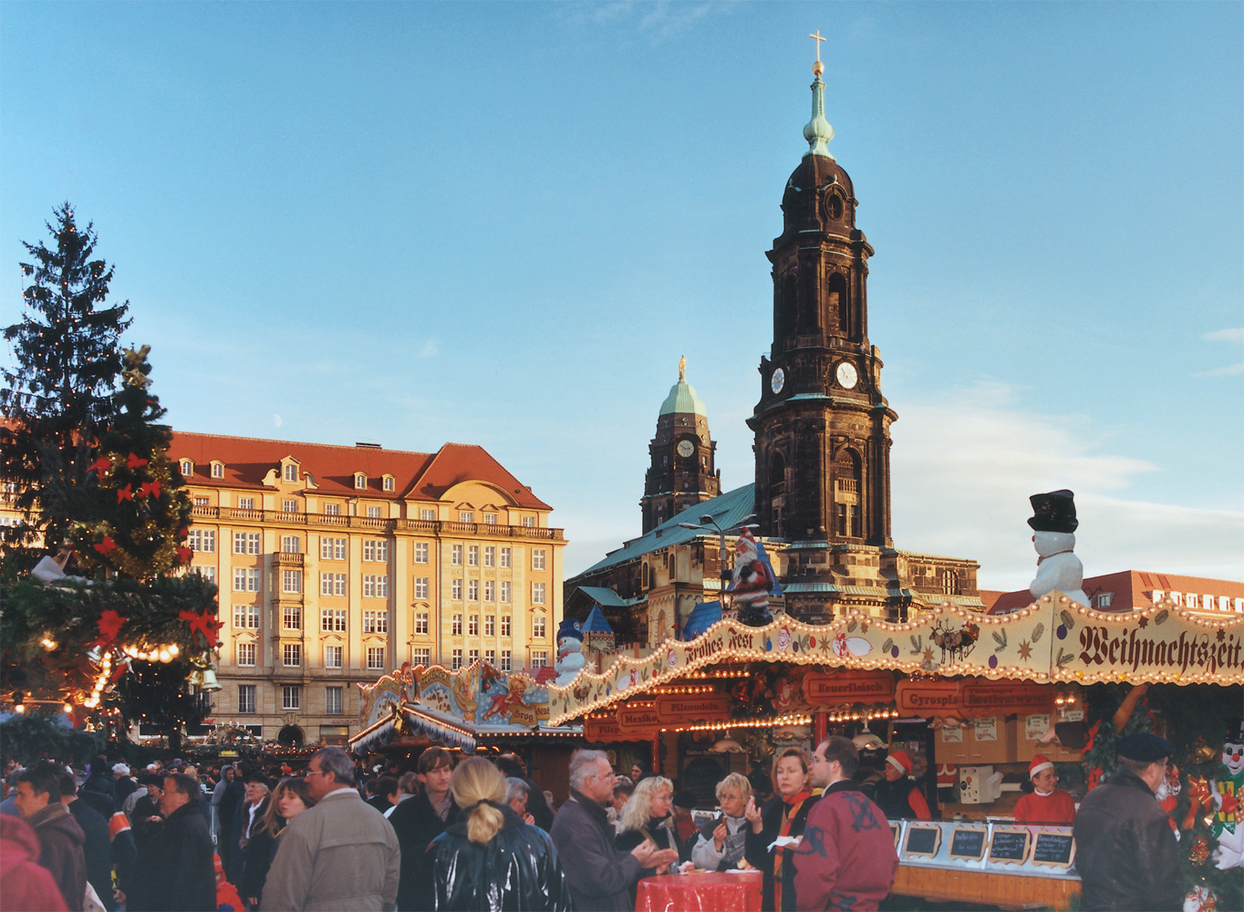 1434年から続く、ドイツ最古のクリスマスマーケットの一つ。クリスマス菓 子・シュトレン発祥の地にちなみ「シュトリーツェルマルクト(=シュトレン市)」と呼ばれています。第2アドベント(クリスマスからさかのぼって3週前の日曜)前日の土曜には、巨大なシュトレンを載せた山車(だし)が練り歩 く「シュトレンフェスト」も開かれます。ドレスデンのシュトレンを名乗れる のは、ドレスデンおよび近郊で通年生産され、小麦粉の量に対しバターの量は 50%、レーズンの量は80%で作るなど厳格な決まりがあります。シュトレンのほかにも、プルスニッツのペッファークーヘン(焼き菓子)や、エルツ山地の手工芸品、プラウエンのレース細工、フライベルクの錫(すず)細工など、旧東ドイツ時代の伝統工芸の数々も見逃せません。