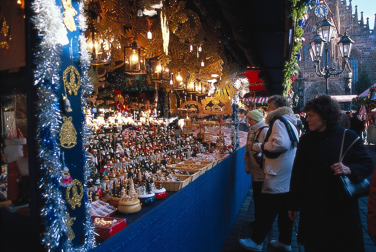 ドイツで最も有名なクリスマスマーケット。中世の面影が残る旧市街で開か れ、マーケットのオープニングには、フラウエン教会のバルコニーに「クリス トキント(天使)」が現れ、開会の辞を述べます。この様子はドイツ国内のニ ュースで放映され、クリスマスマーケットとアドベントの始まりを知らせて くれるのです。マーケットに軒を連ねる屋台は180を超え、クリスマスの装 飾品やろうそく、おもちゃ、手工芸品などが所狭しと並びます。ニュルンベル クの名物といえばレープクーヘン(焼き菓子)。中でも小麦粉の代わりにナッツを主原料とした「エリーゼン・レープクーヘン」は、レープクーヘンの中でも最高級品とされており、「デュル」などの市内のパン店で購入できます。
