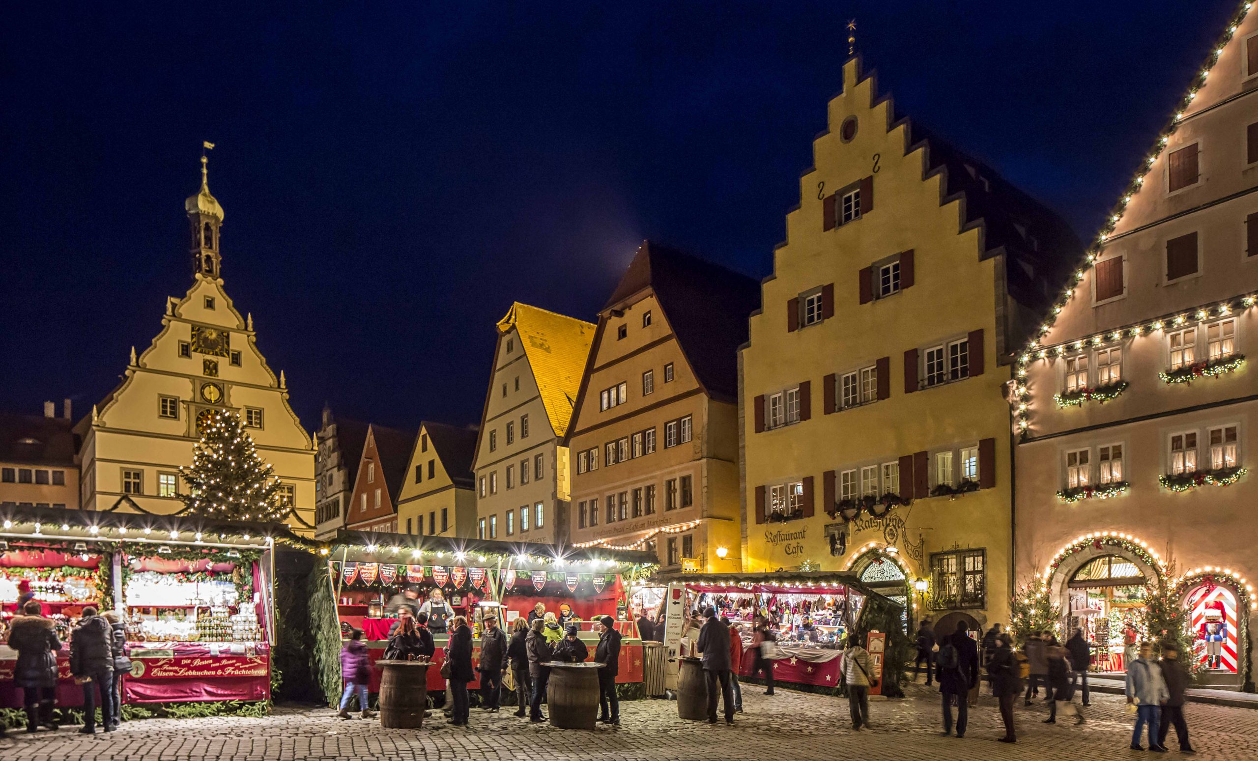 城壁に囲まれた中世の町並みが広がるローテンブルクのクリスマスマーケットは、まるでおとぎ話の世界のよう。規模は小さめながら、500年もの歴史があり、旧市街の街並みに合わせたシックな雰囲気が魅力です。屋台でのおすすめ料理はマジョラムというハーブが利いたフランケン風焼きソーセージや、ローテンブルクが発祥とされる揚げドーナツのシュネーバル。地酒のフランケンワインを使った“白い”グリューワインもこの土地ならではの逸品です。