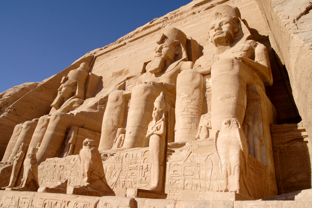 アブシンベル神殿はスーダンとの国境に近いエジプト南部にある岩窟遺跡です。太陽神ラーを祀った大神殿と、女神ハトホルを祀った小神殿があり、いずれもラムセス2世によって建てられました。大神殿の正面にはラムセス2世の4体の巨像が置かれています。毎年、2月22日と10月22日の2回、神殿奥まで朝日がさし込み、ラムセス2世像を照らす「太陽の奇跡」が見られます。夜は「音と光のショー」が行われ、人気を集めています。