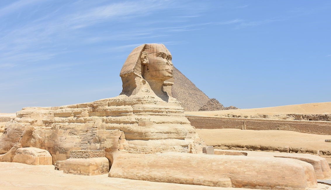 3大ピラミッドの正面に横たわるのがスフィンクスです。人間の頭にライオンの体を持ち、「太陽神」としてエジプトでは信仰の対象とされています。このスフィンクスは長さ73.5メートル、高さ20メートルで、一枚岩の石像としては世界最大とされますが、建造された時期や意味付けなどは分かっていません。過去には砂に埋もれていた時期もあり、何度か修復されていますが、かつて付いていたあごひげは脱落して現在はカイロ博物館と大英博物館に保管されています。